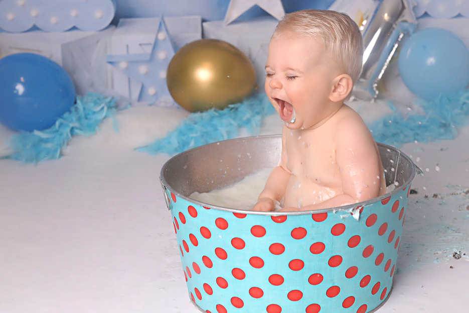 Lorsque votre Bambin a fini avec le gâteau, je vous prépare un petit bain de lait pour qu'il joue encore un peu....